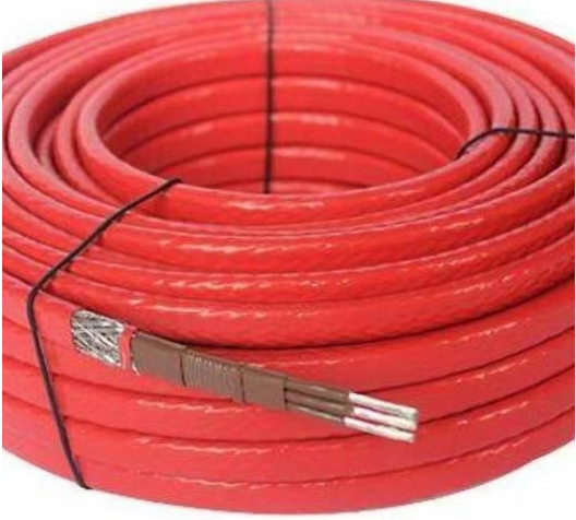 電源母線為二根平行絕緣銅線,在絕緣層中間纏繞電熱絲,并將該電熱絲每隔一定距離(即“發(fā)熱節(jié)長”)與母線連接,形成連續(xù)并聯(lián)電阻。母線通電后,各并聯(lián)電阻發(fā)熱,因而形成一條連續(xù)的加熱帶。
