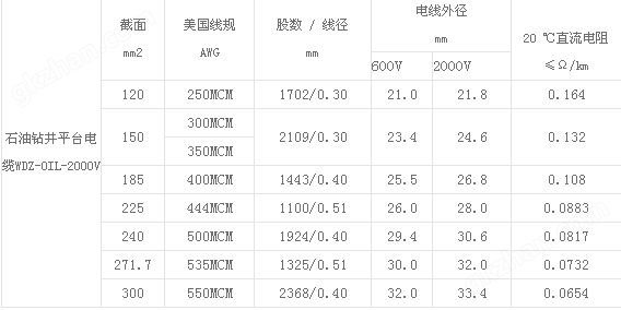 石油鉆井平臺WDZ-0IL-500MCM一,石油鉆井平臺WDZ-0IL-500MCM主要適用額定電壓2kV及以下的石油平臺鉆井架上大功率電機(jī)、壓縮機(jī)及各種泵類的電力傳輸系統(tǒng)及船舶動力系統(tǒng).電纜具有良